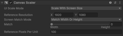 캔버스 스케일러(Canvas Scaler) 컴포넌트는 캔버스 내 UI 요소의 전체적인 스케일과 픽셀 밀도를 제어하는 데 사용됩니다. 스케일은 글꼴 크기와 이미지 경계 등 캔버스 아래의 모든 요소에 영향을